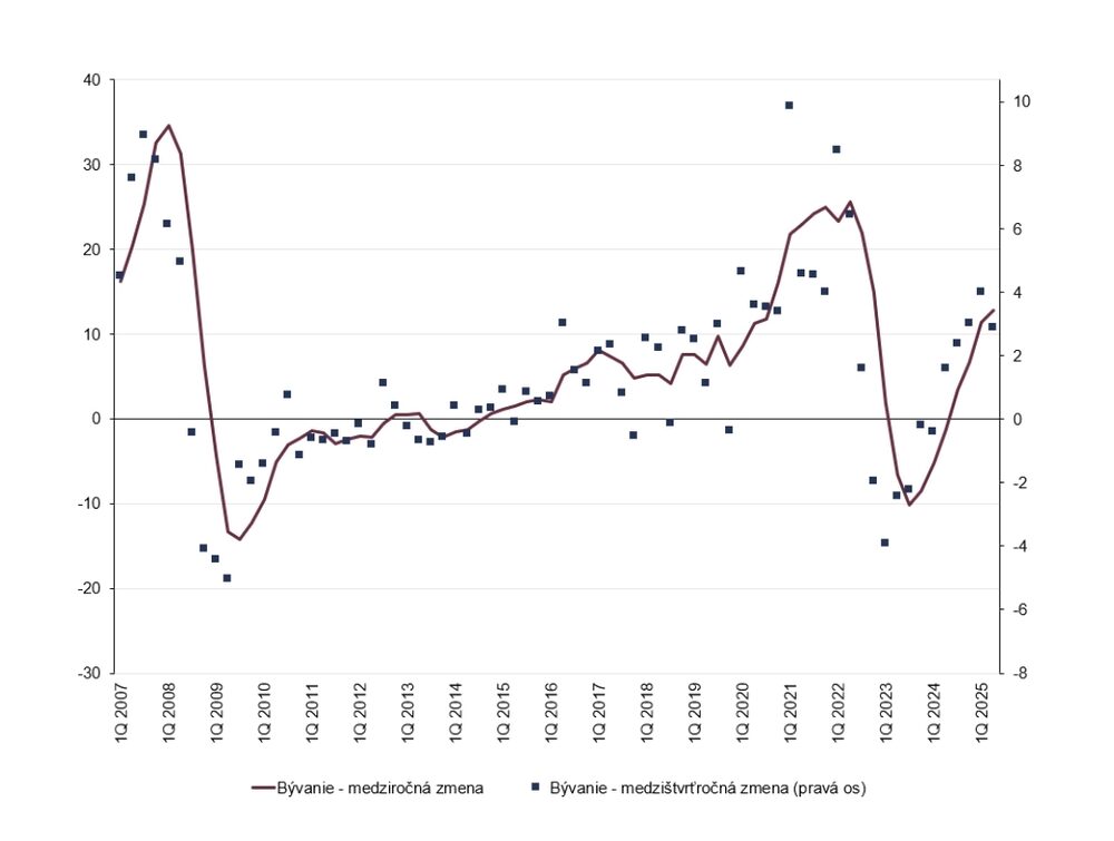 Graf 1: Vývoj priemernej ceny bývania (medziročná a medzištvrťročná zmena v %)