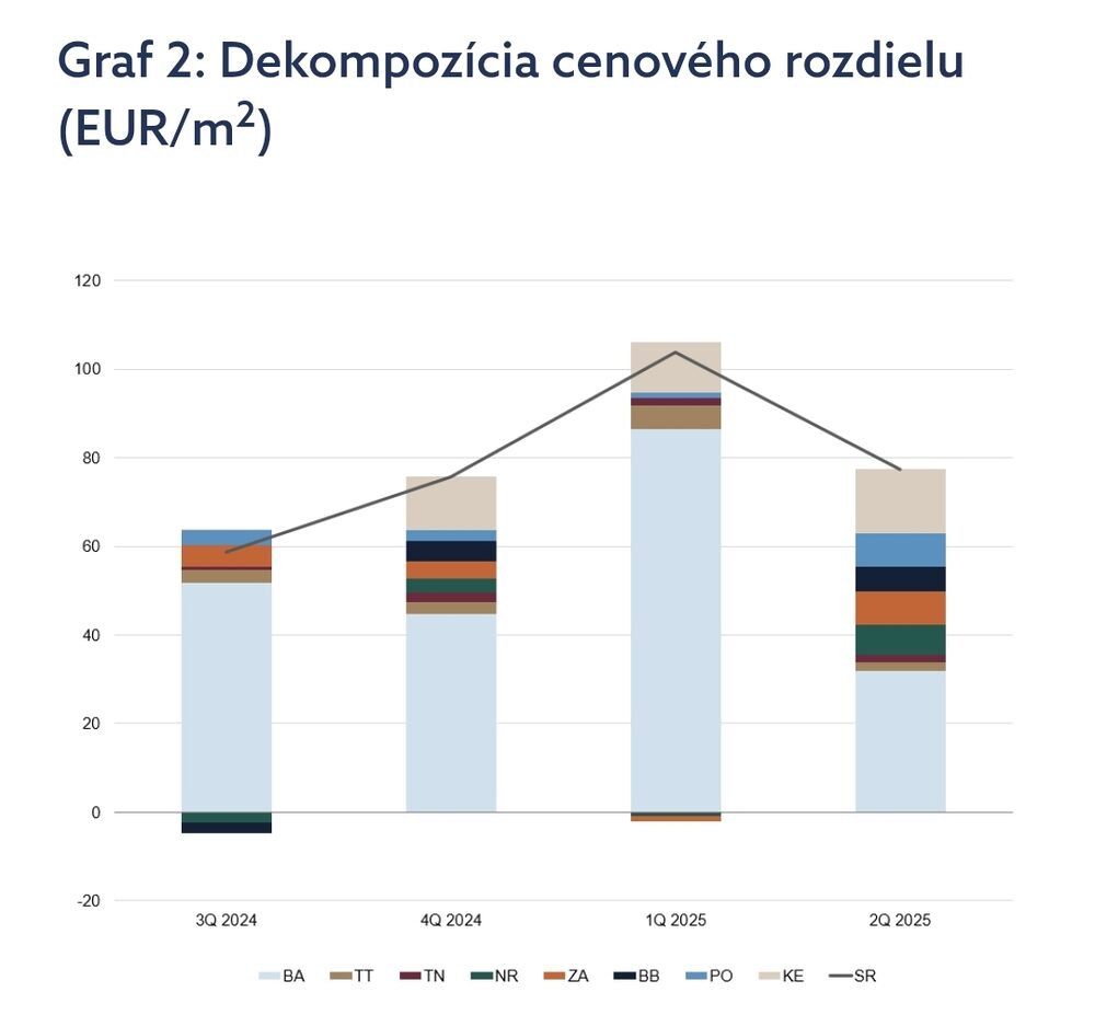 Ponukové ceny nehnuteľností vzrástli v druhom štvrťroku 2025 o 2,9 % v porovnaní s predchádzajúcim štvrťrokom. Oproti rovnakému obdobiu v minulom roku sú dnes o 12,8 % vyššie (graf 1). V prepočte na eurá ide o medzištvrťročný nárast 77 EUR/m2. Podiel Bratislavského kraja na tomto raste je omnoho nižší, ako na začiatku roka (graf 2). Výrazne vzrástli príspevky Prešova, Žiliny, Nitry aj Banskej Bystrice, zatiaľ čo Košický kraj sa drží na číslach z posledných štvrťrokov. Ceny sa tak už nachádzajú na úrovni o 2,4 % vyššej ako bolo maximum z roka 2022, teda ešte spred obdobia zvyšovania úrokových sadzieb.