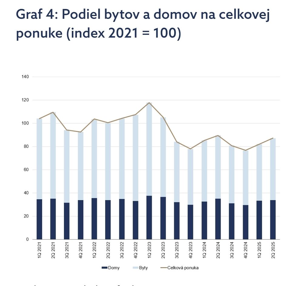 Počty ponukových inzerátov sa zvýšili aj v druhom štvrťroku, kopírujú tak trend z roka 2024. Oproti prvému štvrťroku ich bolo o 6,2 % viac, medziročne je ich počet však aj naďalej v mínuse (graf 4). Ponuka postupne rastie už druhý štvrťrok za sebou. Vlani bol vývoj rovnaký, počas leta sa však rast zastavil. Podiel bytov na celkovej ponuke sa mierne zvýšil.