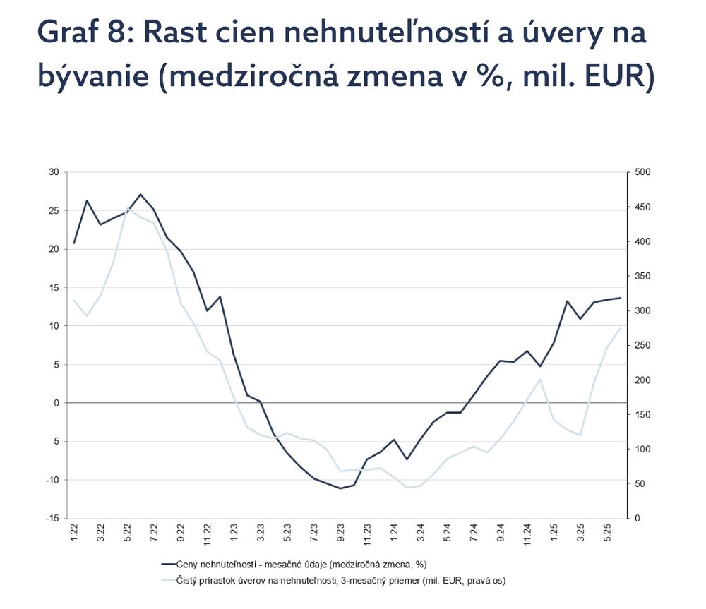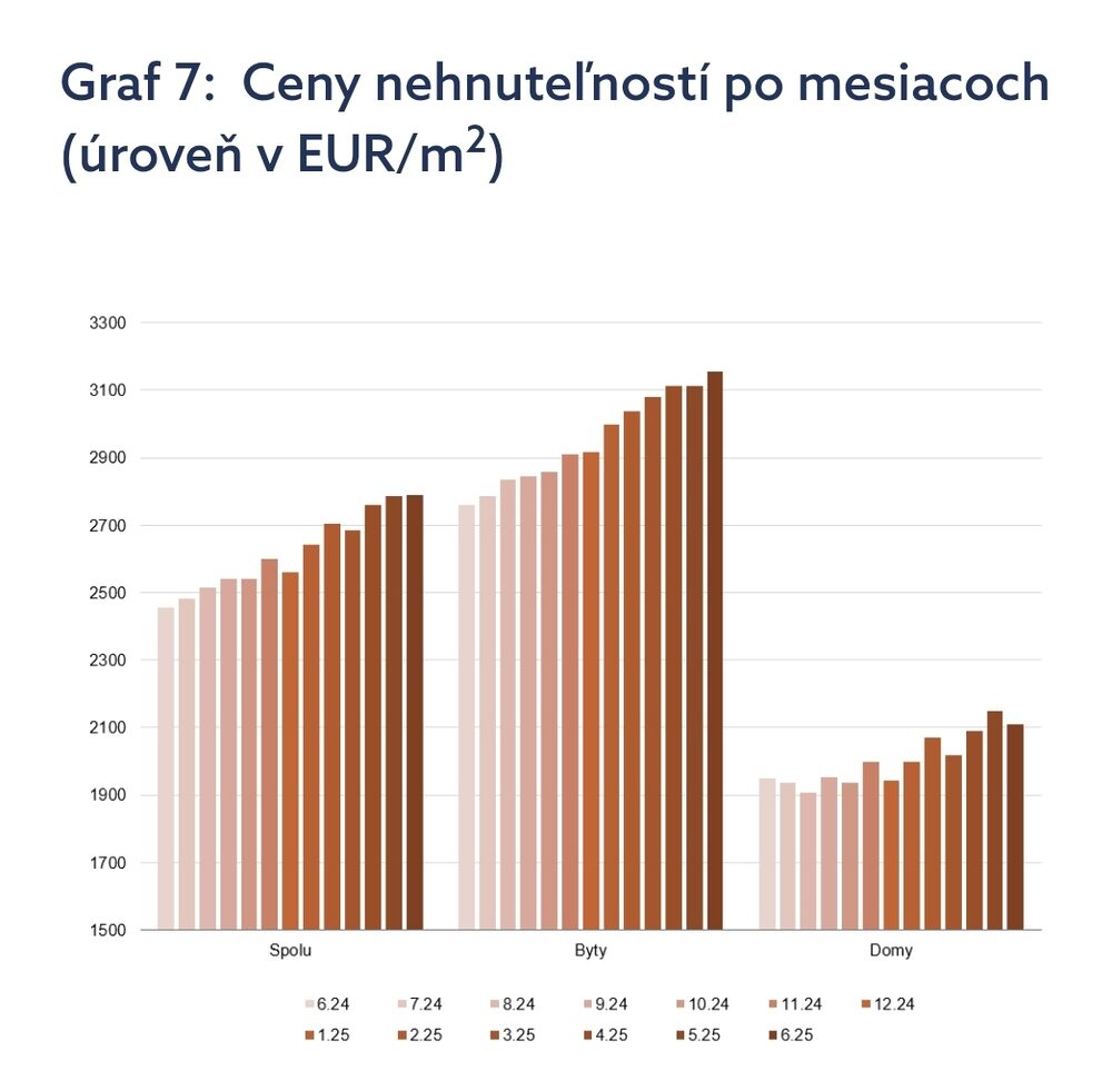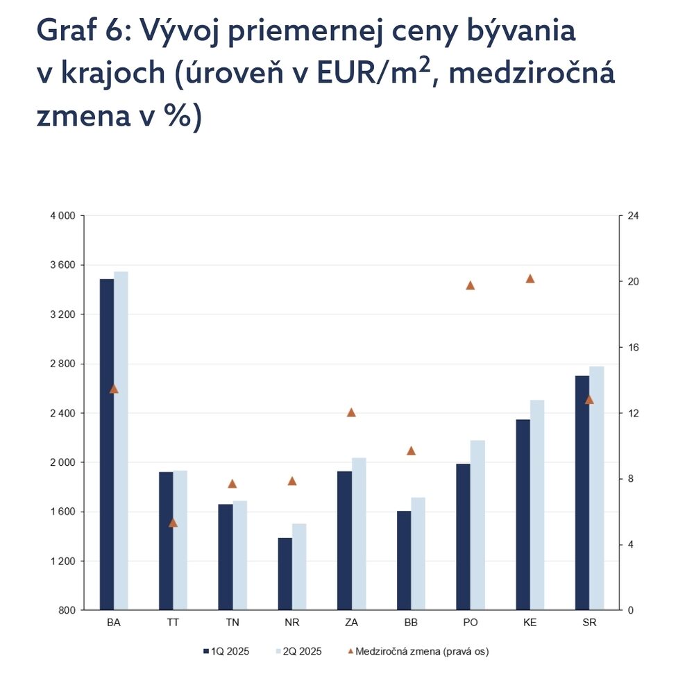 Ceny nehnuteľností v polovici roka 2025 napriek slabnúcej ekonomike ďalej rastú, medzi štvrťrokmi vzrástli o 2,9 %. Ceny bytov aj rodinných domov dosiahli nové historické maximá. Regióny cenovo dobiehali Bratislavu, ktorá vystrelila na začiatku roka. Najvyšší rast sme zaznamenali v Prešovskom a Nitrianskom kraji. Zdražovanie sa týkalo predovšetkým apríla, v ďalších mesiacoch sa už priemerná cena menila v menšej miere.