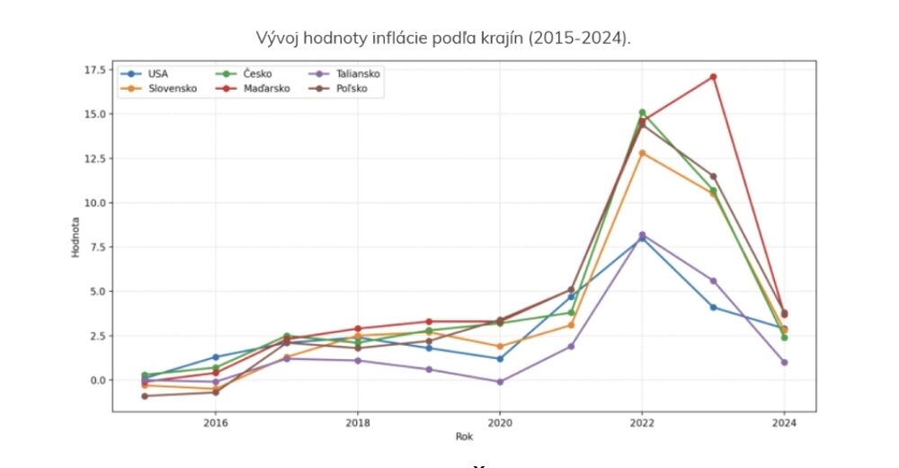 • 2024: Slovensko približne 2,8 %, Česko približne 2,4 %, Poľsko približne 3,8 %, Maďarsko približne 3,7 %, USA približne 2,9 %, Taliansko približne 1 %.